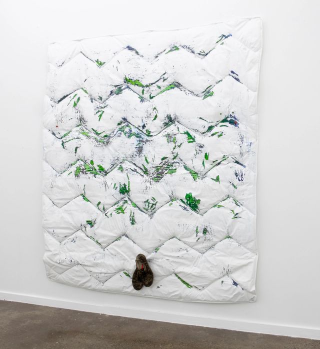 Framing the civic space as a natural meeting place for the body and how it is governed, Cullen’s works draw attention to and critique the value systems at play in this public space. By salvaging discarded objects for use in his works, Cullen elevates materials that are typically overlooked. With this approach, fabric cut from an abandoned mattress on the street can be stretched to become a canvas for painting. Through attention to the intricacies and inequalities of value within society, his work challenges viewers to question and reassess these systems, ultimately encouraging a more nuanced understanding of value in the urban context.
