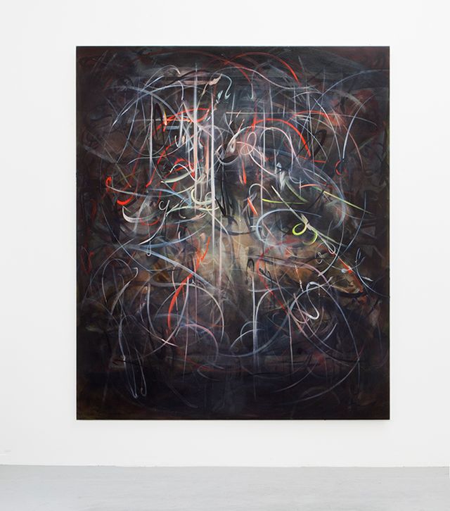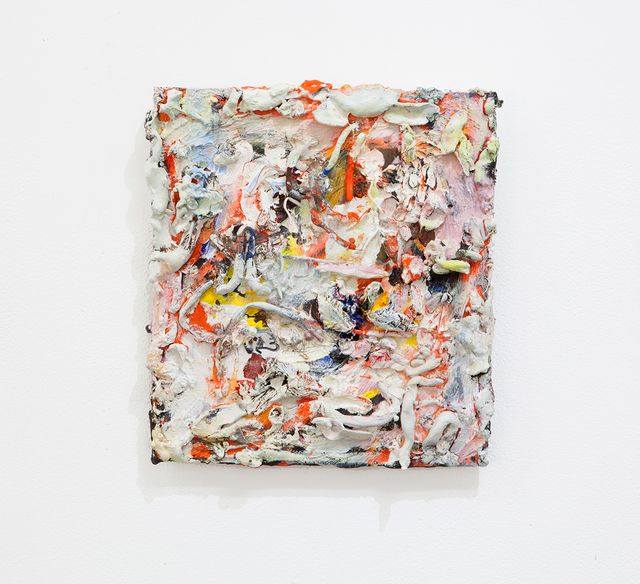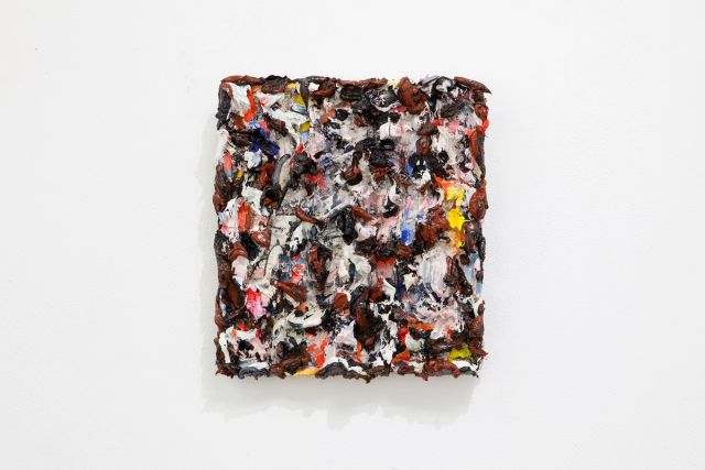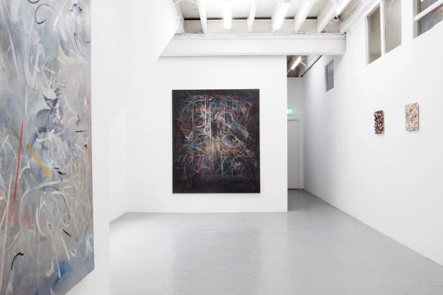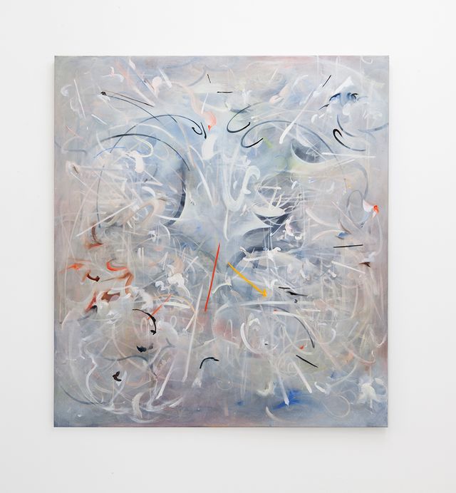 Burrough’s practice is increasingly focused on allowing the body to dictate its needs, welcoming fleeting instances of irreconcilable paradox as the body translates the mind’s momentary escape from cognisance. Working on larger surfaces throughout this body of work, Burrough has moved away from defining conceptual frameworks to allow energetic formalism to emerge. The physical manifestation of this immediacy can be seen in the open pictorial planes of Burrough’s recent paintings. Exploring a more muted colour palette than works exhibited at LON Gallery in 2019, Burrough’s expansive canvases have led the artist to explore the physical rhythms of the act of painting. In dark vortexes of black, swathes of washed white and surges of oranges and blues, Burrough pushes the pictorial plane into comprehensible chaos to produce canvases evenly occupied by fields of line, colliding to create organic textures and incidental moments of perspective. Equally, Burrough’s recent sculptural paintings demonstrate a reactionary approach to working with non-traditional materials. Often incorporating sand, plaster, gap filler, air dry clay, oil paint and glue, the chemical properties and temperamentally of each material dictates Burrough’s response. Protruding from the picture plane into three-dimensionality, Burrough synthesises conventions of painting and sculpture to create works rich in texture and tactility. The intuitive process to layer and stack materials encapsulates Burrough’s ambition to make seen the physical act of making – every flash of colour or coil of clay feels at once contingent and deliberate.