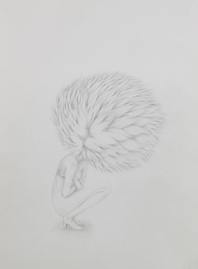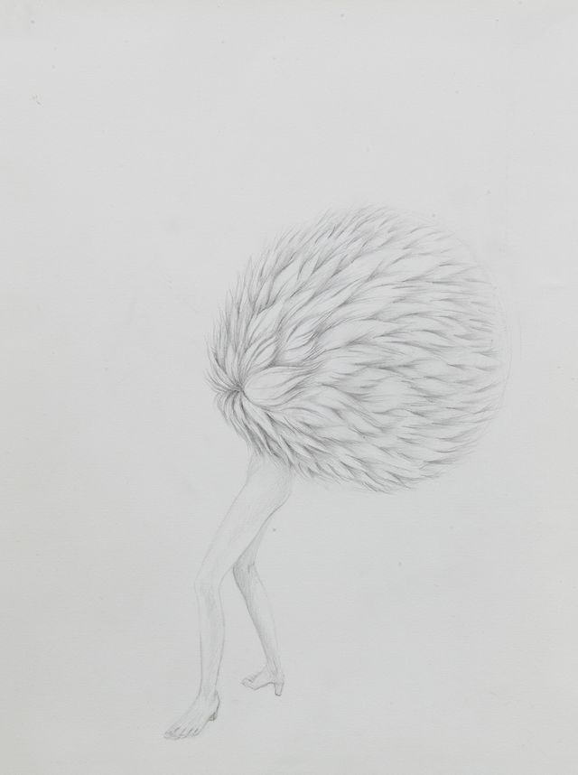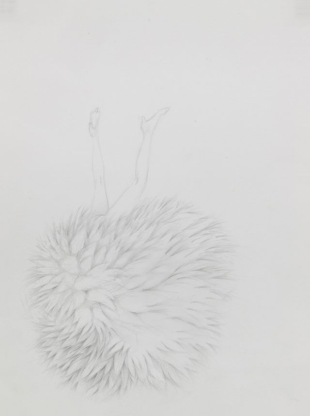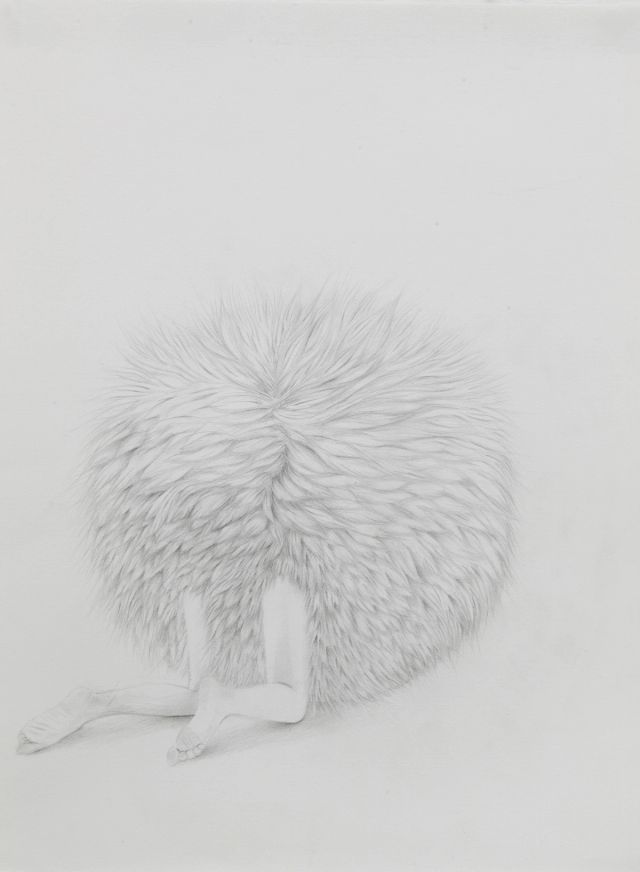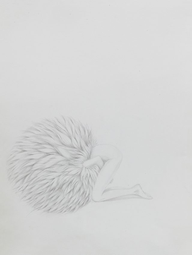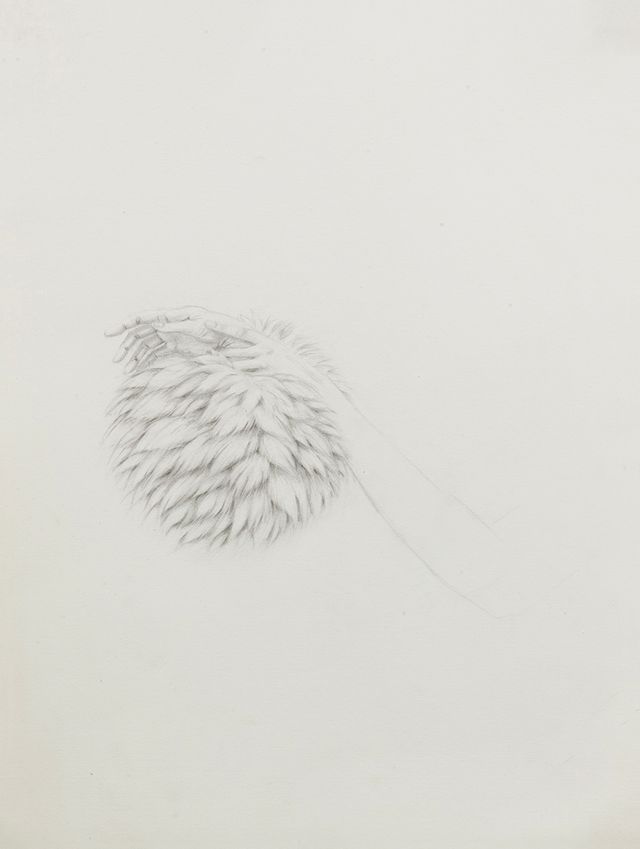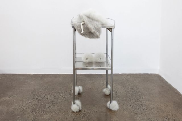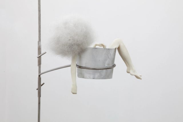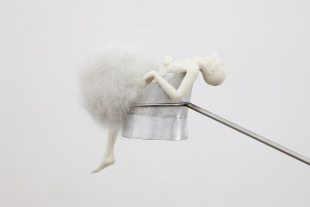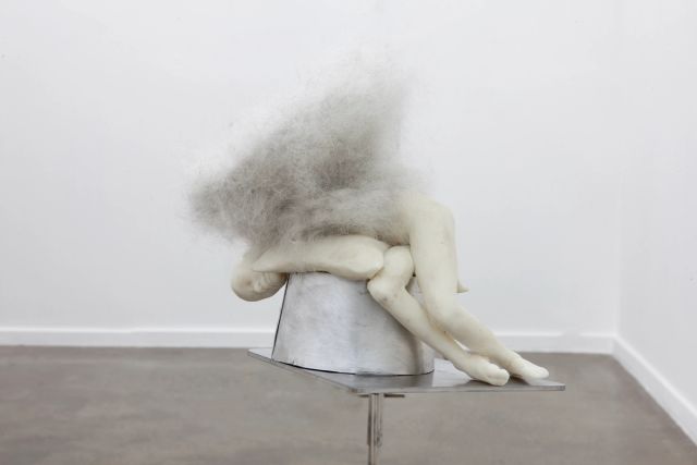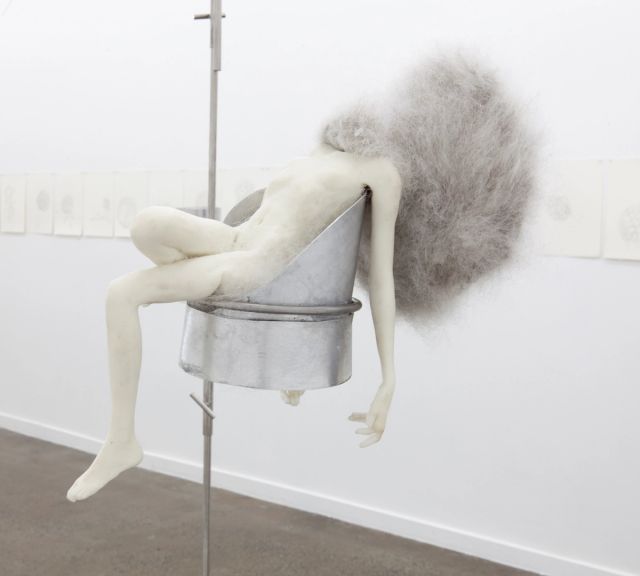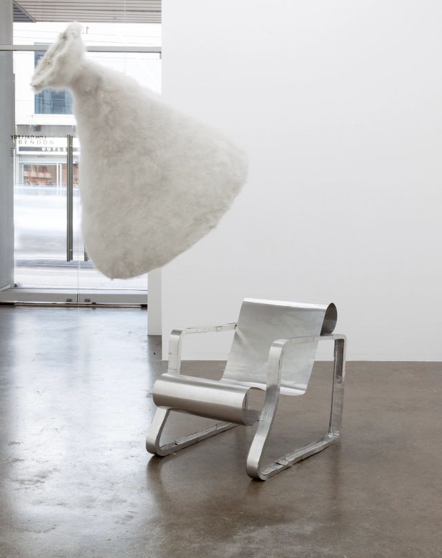 Reduced in scale, languid, hand-sculpted human forms cast in a mixture of beeswax and marble dust rest in stainless steel bowls, partially obscured by hand-crocheted orbs of poodle fur. Complementing the figurative works in the show is a scale reproduction of Alvar Aalto's no. 41 chair, which the Architect designed for the Paimio sanatorium in 1932. Ellis’ version is reimagined with paper-thin stainless steel sheeting, a form that would collapse under the weight of its intended human inhabitant.