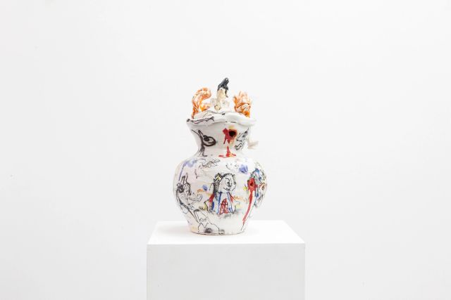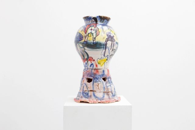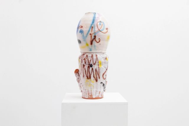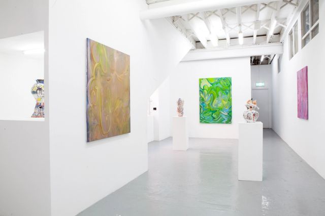 The exhibition For and Against Classicism brings together the work of Peta Petrakis and Ryan Hancock. Their practices, working across painting and ceramics, offer a departure from classicism, critiquing the art historical and cultural expectations of each medium. Petrakis and Hancock exploit symbolic ambiguity and material malleability to free their work from rigid frameworks. For Petrakis, the mono-hued abstraction of her practice draws from ancient Greek motifs to examine personal histories and contemporary visual culture. For Hancock, the comic manipulation of clay subverts traditional ceramic conventions, resulting in painterly works riddled with satire and dark humour.