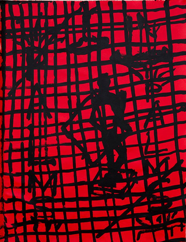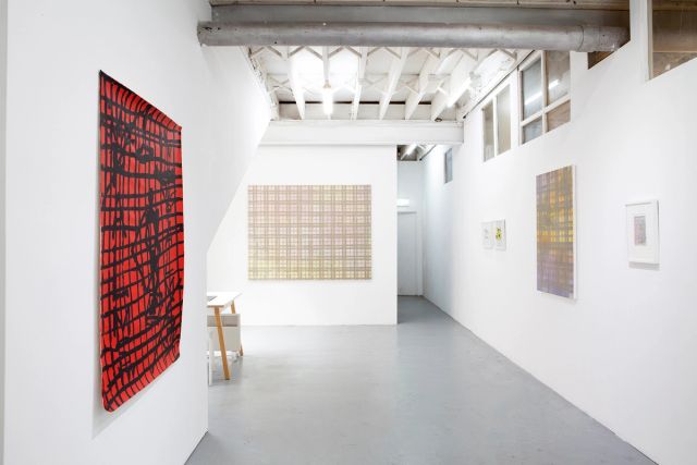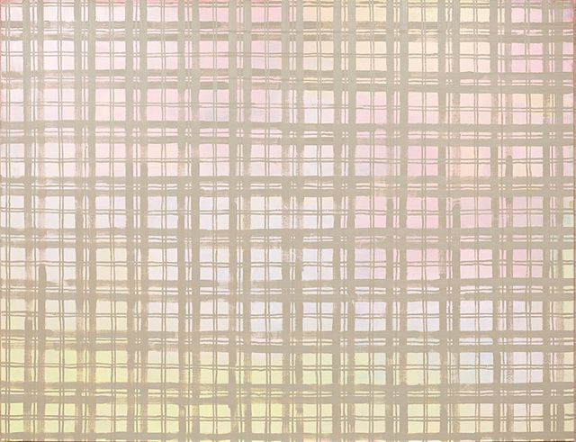 Here exist none of the high formalist concepts of the grid. Instead, in this painting the grid comes as a direct response (and in exact scale) to the wallpaper patterns that completely cover the walls of Williams' studio, a disused office space in Kirrowee.
