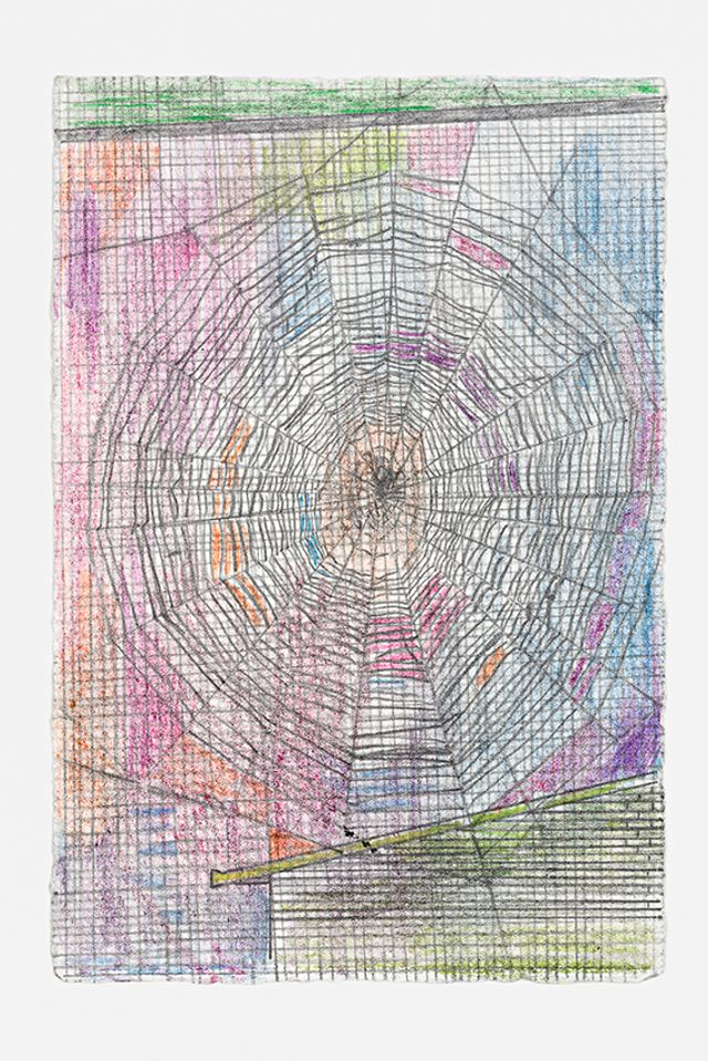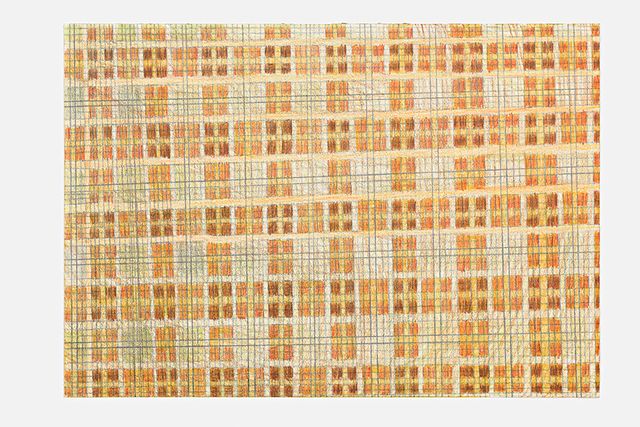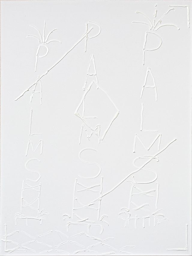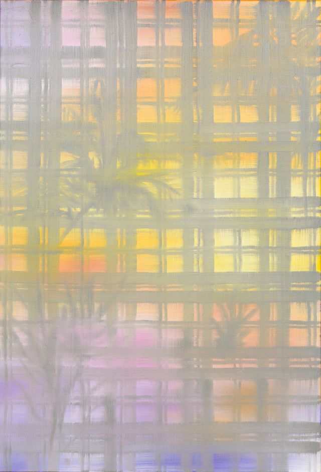 In Office Space/California Fade, 2017, a steadily painted latticework with wispy dry-brushed edges divides the entire picture plane. Through the gaps in the lattice grid can be seen some palm trees painted in the same beige colour. In the distance a thin sky smoulders with a classic sunset blended in dusty lilacs, lemon yellows and deep orange. This painting is typical of Williams' recent works in which the grid becomes a visual barrier. The viewer is trapped, forced to look out at the world through small open squares, into the dreamy distance with its fast fading sunset. It's a melancholy scene, as we all know how fleeting sunsets are.