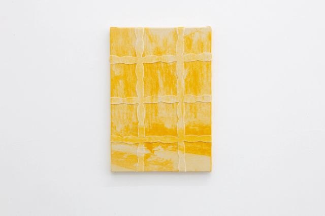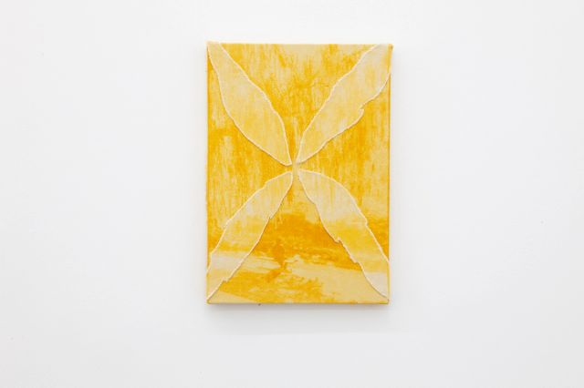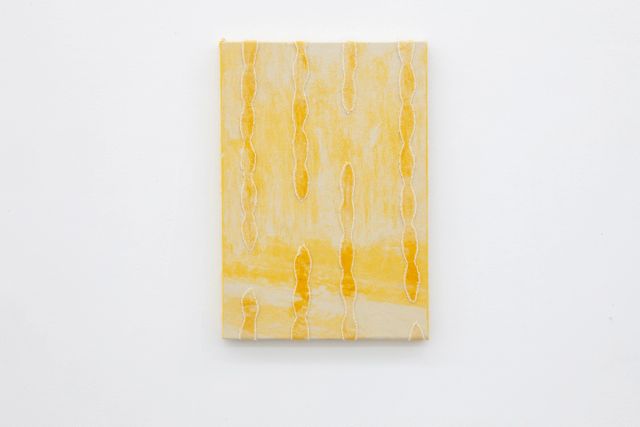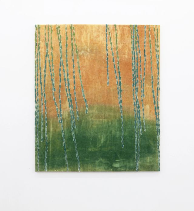 'Willow relief' continues Eaton’s exploration of the metaphysical qualities of light, colour and materiality through his sensitive and distinctive approach to printmaking. Eaton’s prints are developed through exposure to sunlight. During their exposure, he adjusts the work based on the time of day, strength of light, and shadows, to heighten their bodily and temporal characteristics. The prints are subsequently reworked with hand-stitched appliqué. In the instance of ‘Willow relief’, the prints are overlain with a patterned motif based on the leaves of a willow tree.
